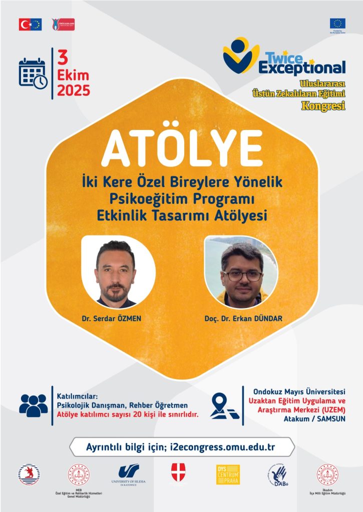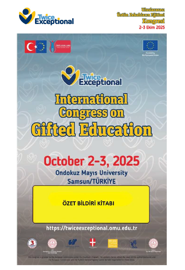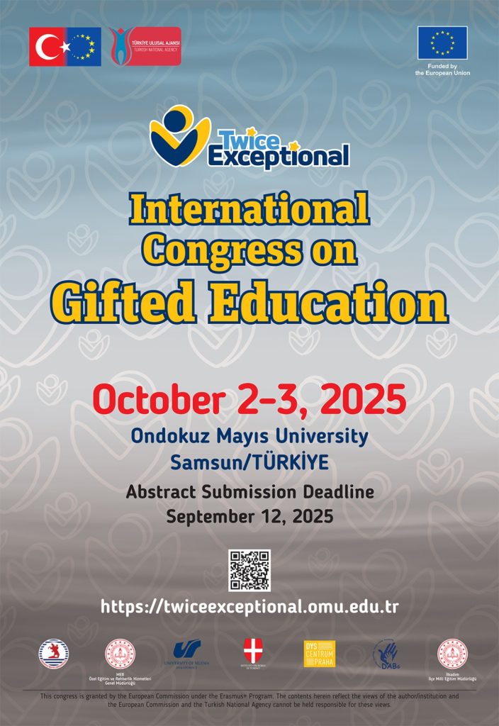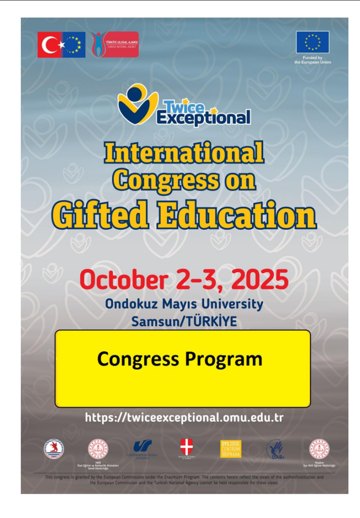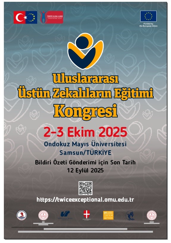 2-3 Ekim 2025 tarihlerinde Samsun’da düzenlenecek olan kongre ana teması iki kere özel çocuklar (2e) olmakla birlikte, kongrede üstün zekalı çocukları merkeze alan çalışmalara yer verilecektir. Uluslararası nitelikteki kongre çağrılı konuşmacıları, paneller ve sözlü bildirileri kapsamaktadır. Hakem değerlendirmelerinin ardından kabul edilen ve kongrede sunumu gerçekleştirilen bildiri özetleri ISBN’li Kongre Bildiri Özetleri Kitabı’nda ve tam metinleri ise Kongre Bildiri Kitabı’nda yayınlanacaktır. Sizleri, Samsun’da görmekten mutluluk duyacağımızı belirtir, çalışmalarınızda kolaylıklar dileriz.